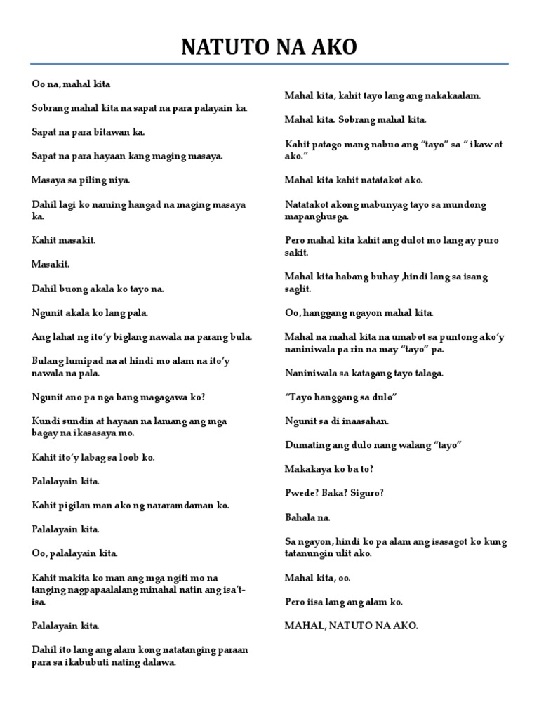Mahal Bakit ka nawala akala ko ba hanggang sa dulo. SA MGA BAGAY NA- SPOKEN POETRY Noon ang sikip-sikip ng mundo Dahil sa pagmamahalan nating totoo Umuunti ang tao parang ikaw lang at ako Andito ka sa harap ko at. KAIBIGAN MO AKO HANGGANG DULO.