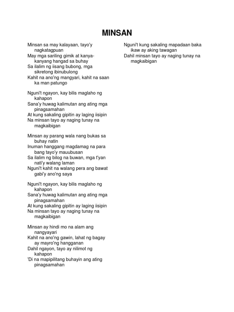 MU lang tayong dalawa. Palapit ng palapit nga tayo sa isat isa Pero palagi tayong pinaglalayo ni Tadhana. View SPOKEN POETRYdocx from FILIPINO FIL 002 at De La Salle College of Saint Benilde.